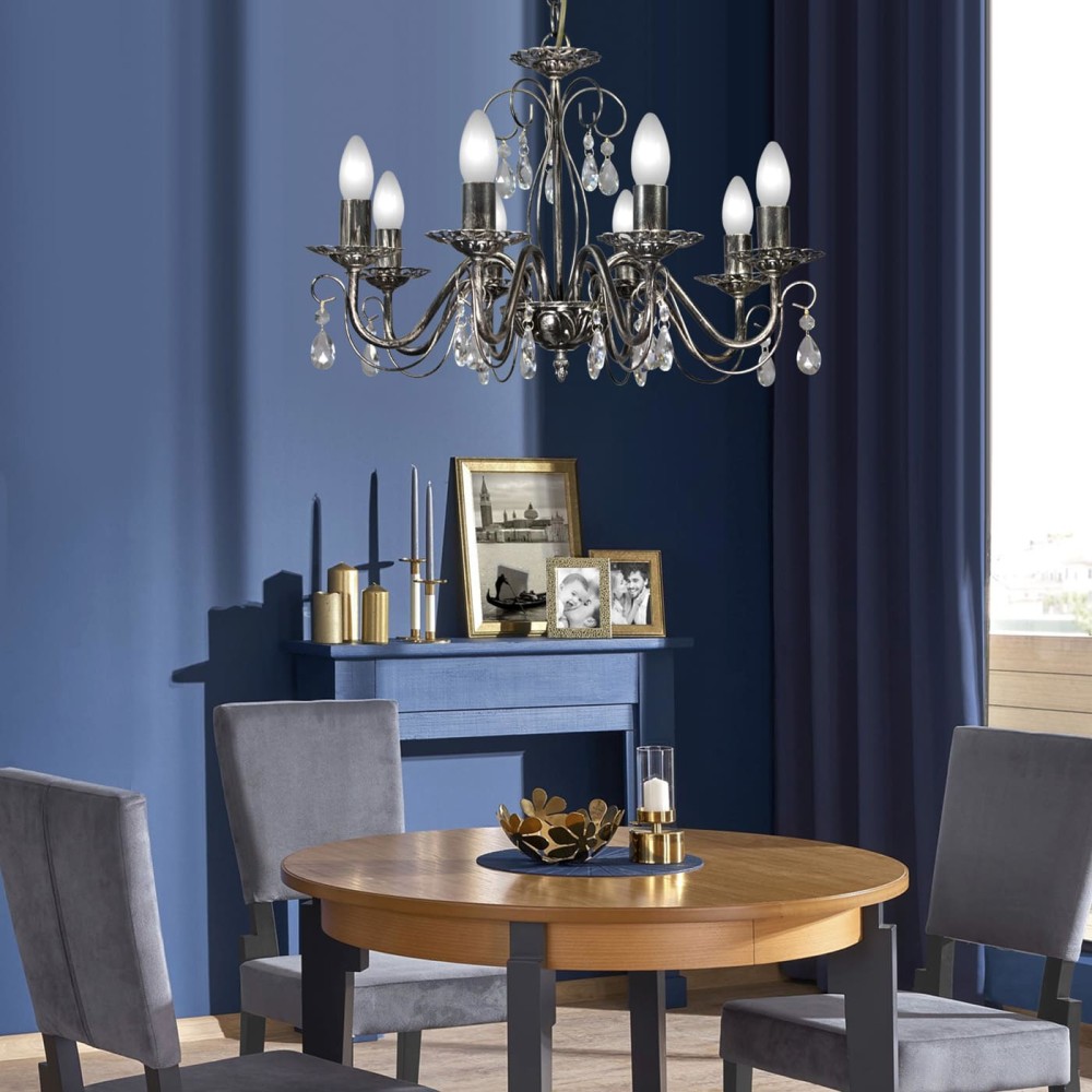 • Роскошный дизайн: Люстра Аврора воплощает в себе дух классики и неоклассики. Использование металла, обработанного патиной серебра, придает ей благородный и утонченный вид. Сочетание черного цвета с патиной серебра создает эффектный контраст, который подчеркивает красоту хрустальных подвесок.